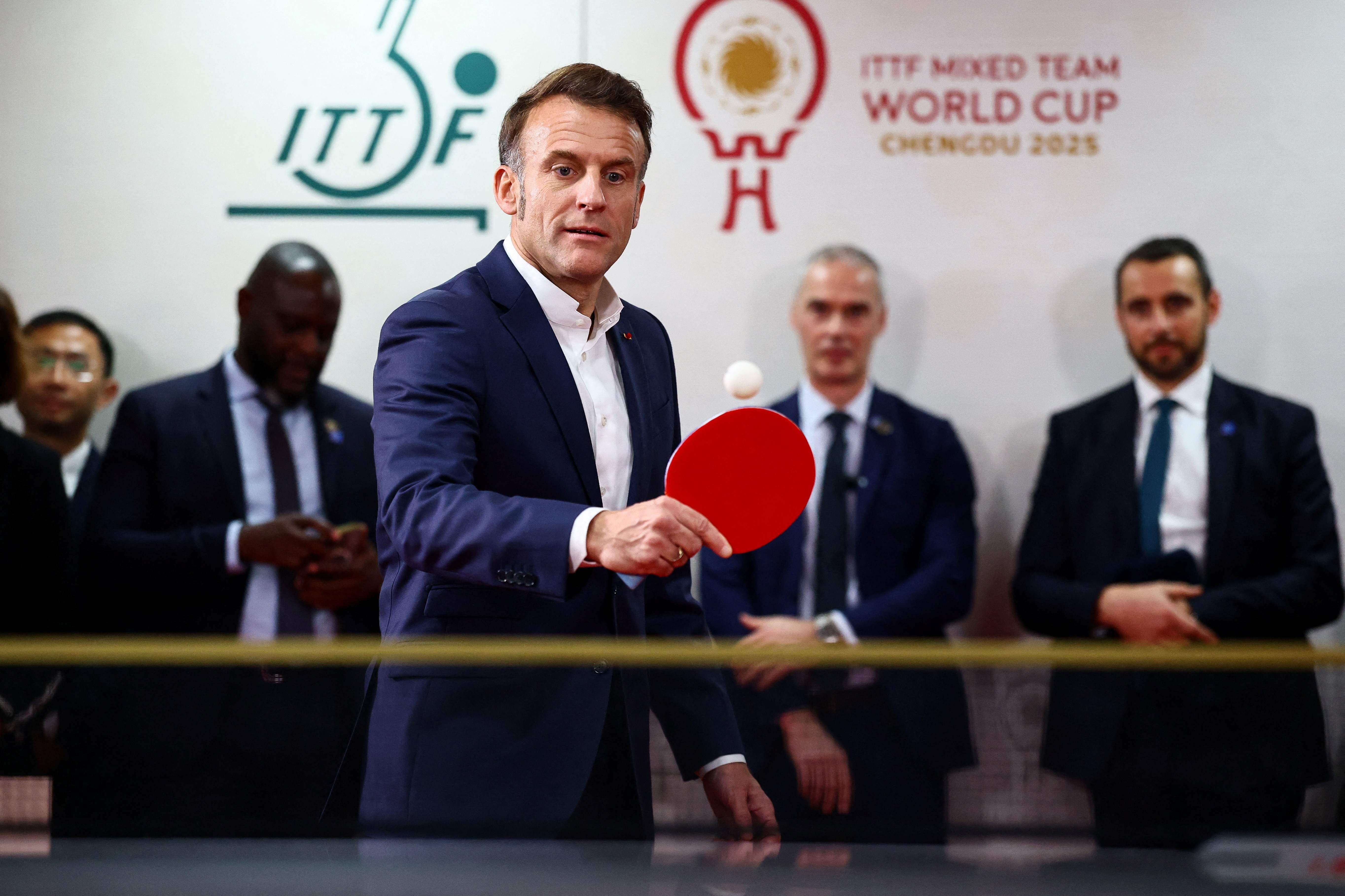 12月5日,在成齐,法国总统马克龙与中法乒乓球分解员会面时打乒乓球。视觉中国 图